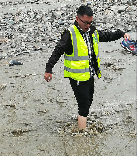 到达采样目的地错那县觉拉乡觉拉村,由于连日降雨,导致河水上涨,怎么办?同事文凯说必须想办法过去,为了公司利益,为了客户的数据能够按时出具。但也必须要考虑自己的安全我们绕河找相对浅的地方,脱掉鞋,过河,可是浅的地方也差不多到膝盖了。
